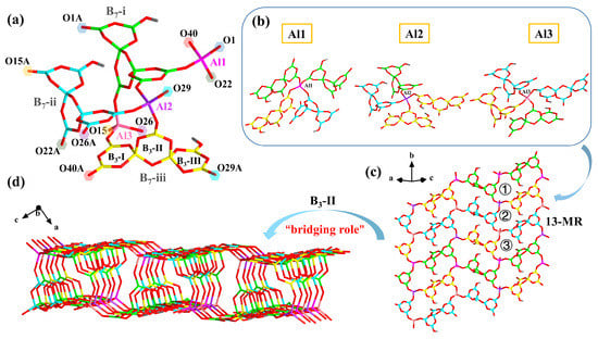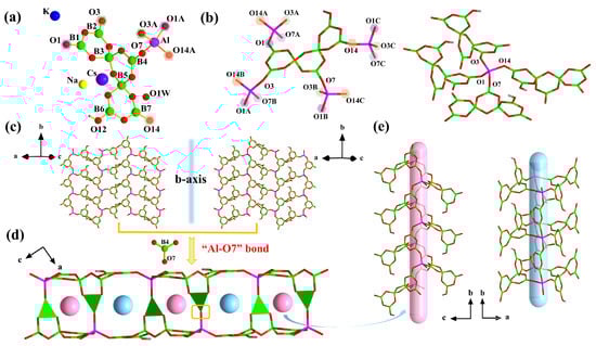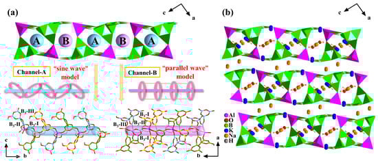 Two kinds of channels existed, and each B3O3 ring played a different role (Figure 4a). Channel A was made of two AlO4 tetrahedra, two B3-I, and B3-II rings. The B3-I was responsible for bonding adjacent AlO4 tetrahedra in order to extend along the b-axis, while B3-II played an effect on linking the B3-I and AlO4 tetrahedra to form a closed window. The B3-III could be seen as a decoration hanging on the channel wall. However, the situation of channel B was diverse. It consisted of two AlO4 tetrahedra, two B3-II, and B3-III rings. The B3-II and B3-III only played a part in a closed window, while another B3-I linkedup the neighboring windows. From this perspective, channel B was composed of parallel windows, as channel A’s were linked end to end. In view of this, channel A could be seen as a “sine wave” model, while channel B could be regarded as a “parallel wave” model.