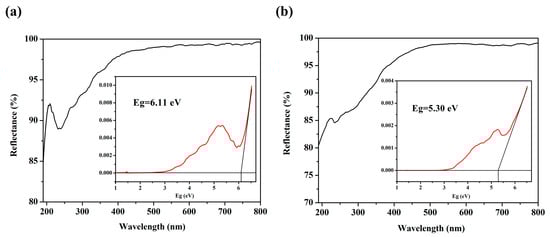 As shown in Figure 5, the UV-Vis diffuse reflectance spectra that has been tested ranged from 190 to 800 nm. The Kubelka–Munk function F(R) = (1 − R)2/2R = α/S was used to calculate the absorption date (α/S), where R was the reflectance, α was the absorption coefficient, and S was the scattering coefficient. The band gaps of 1 and 2 were 6.11 eV and 5.30 eV, indicating that they were wide-band semiconductors. The UV cut-off edges of both 1 and 2 were below 190 nm, revealing that they had potential applications in ultraviolet regions.