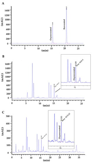 HPLC chromatogram of (A) standard mixture of oxyresveratrol and resveratrol; (B) white mulberry leaf extract from Sakon Nakhon cultivar; and (C) Buriram cultivar.