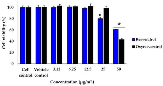 Effect of resveratrol and oxyresveratrol on the viability of RAW 264.7 cells. Cells were treated with the indicated concentration (3.12, 6.25, 12.5, 25, and 50 µg/mL) of resveratrol and oxyresveratrol for 24 h, and cell viability was assessed by MTT assay. The results are expressed as the percentage of surviving cells over control cells. Each value indicates the mean ± SD (n = 3). * indicates significant difference (p < 0.05).