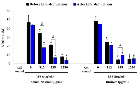 Effects of white mulberry leaf extract on nitric oxide production in LPS-stimulated RAW 264.7 cells. The amount of nitric oxide produced was then determined using Griess assay. The results are expressed as mean ± SD (n = 3). * indicates significant difference (p < 0.05) compared with the cells treated with LPS alone (LPS group). # indicates significant difference (p < 0.05) before and after LPS stimulation.
