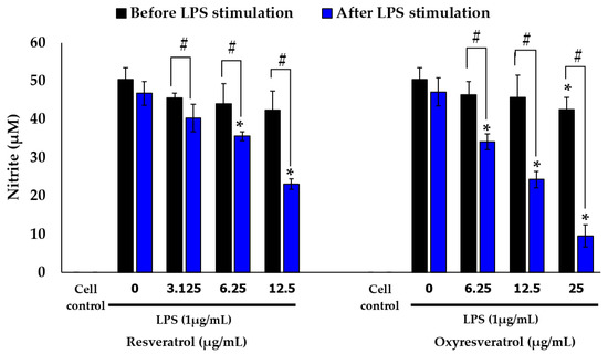 Similarly, the results showed that resveratrol and oxyresveratrol were able to inhibit nitric oxide production in a concentration-dependent manner and the nitrite levels were found to be between 9.54 and 50.42 µM (Figure 6). Additionally, treating the compounds after stimulation with LPS could inhibit nitric oxide more effectively than treating the compounds before stimulation with LPS. Resveratrol at concentrations of 6.25 and 12.5 µg/mL significantly reduced the nitrite levels 1.31- and 2.02-fold when treated after stimulation with LPS. Oxyresveratrol at concentrations of 6.25, 12.5, and 25 µg/mL significantly reduced the nitrite levels when treated after stimulation with LPS 1.38-, 1.94-, and 4.94-fold, respectively. For the untreated RAW 264.7 cells (the cell control), the concentration of nitrite could not be detected.