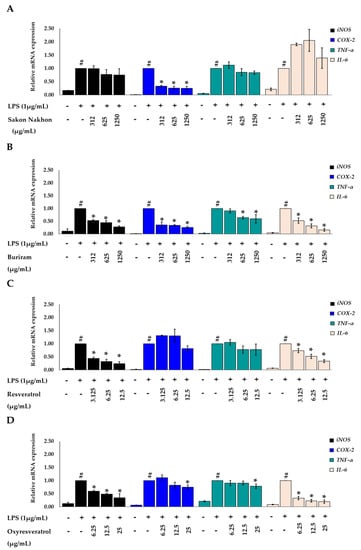 Effects of (A) mulberry leaf extract from Sakon Nakhon cultivar, (B) mulberry leaf extract from Buriram cultivar, (C) resveratrol, and (D) oxyresveratrol on the relative mRNA expression levels of iNOS, COX-2, TNF-α, and IL-6 in LPS-stimulated RAW 264.7 cells. Cells were stimulated with LPS (1 µg/mL) for 30 min and then treated with the extract for 3 h. The mRNA levels were measured by qRT-PCR. Data are expressed as mean ± SD (n = 3). # indicates significant difference (p < 0.05) compared with the cells untreated with LPS (cell control). * indicates significant difference (p < 0.05) compared with the cells treated with LPS alone (LPS group).