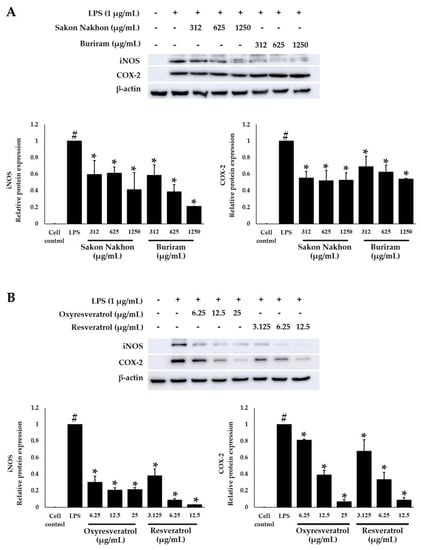 Effects of (A) white mulberry leaf extracts from the Sakon Nakhon and Buriram cultivars, and (B) oxyresveratrol and resveratrol on the protein expression of COX-2 and iNOS in LPS-stimulated RAW 264.7 cells. Cells were stimulated with LPS (1 µg/mL) for 30 min and then treated with the extract for 12 h. Cell lysates (30 μg/mL) were separated by SDS-PAGE, transferred to a PVDF membrane, and detected with anti-COX-2, anti-iNOS, and β-actin antibodies. β-actin was used as an internal control. Data are expressed as mean ± SD (n = 3). # indicates significant difference (p < 0.05) compared with the cells untreated with LPS (cell control). * indicates significant difference (p < 0.05) compared with the cells treated with LPS alone (LPS group).