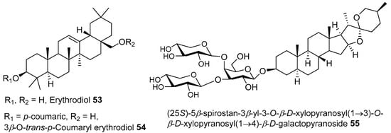 Derivatives of saponin (53–55) (Figure 4) were also identified, along with the biflavonoids glycoside 33, quercitrin 4, and myricitrin 11, in methanolic leaf extracts by Gedara et al. [].