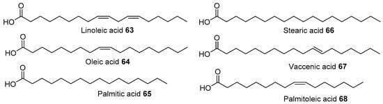 Youzbachi et al. [] should also be mentioned for their investigation into the antioxidant of A. saligna seeds collected in Tunisia. Their methanolic extract displayed scavenging capacity in the DPPH assay, with an average IC50 value of 590 μM of Trolox equivalent antioxidant capacity (TEAC). The GC analysis of the methanolic extract revealed a high content of fatty acids, especially health-promoting fatty acids [reported in % of the total content (101.7 g/kg of dried weight (DW) of seeds], which included linoleic acid 63 (61.11–65.45), and oleic acid 64 (19.67–22.85). Smaller proportions of palmitic 65 (9.18–9.98), stearic 66 (1.49–1.82), vaccenic 67 (1.13–2.05), and palmitoleic 68 (0.34–0.58) acids were also quantified (Figure 5). The phenolic content of the extract was reported to be 1.91 g of gallic acid 25 equivalent kg−1 DW, while the total flavonoid content was shown to be in an average of 0.40 g of rutin 6 equivalent kg−1 DW. In addition, the group used the Kjeldahl assay to estimate the protein content of the seeds. The assay revealed a high content of protein, with an average of 107.2 g kg−1 on DW of seeds. This study did not conduct a detailed chemical analysis of the phenols and flavonoids to allow for further discussion. However, the estimated phenolic and flavonoid contents were evidently linked to the scavenging capacity observed in the seed extract. Notably, markedly high contents of linoleic acid 63 (61.11–65.45%) and oleic acid 64 (19.67–22.85%) were identified in the seed extract. These unsaturated fatty acids are known to benefit cardiovascular health [].