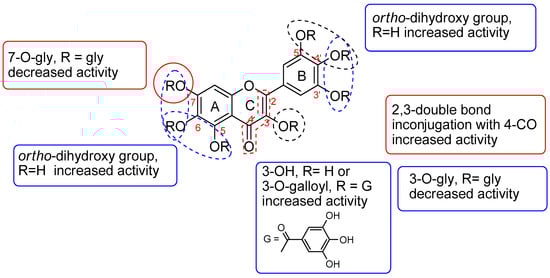 Xu and Lee [] investigated 38 plant-derived flavonoids against antibiotic-resistant bacteria such as MRSA, multidrug-resistant Burkholderia cepacian, and vancomycin-resistant enterococci (VRE); they showed that myricetin 10, kaempferol 22, quercetin 3, and luteolin 19 were active against MRSA. In contrast, only myricetin 10 was found to be active on multidrug-resistant B. cepacian and VRE with MIC values of 32 and 128 μg/mL, respectively. The results highlight the importance of 3′,4′, and 5′-OH of ring B against multidrug-resistant bacteria. Furthermore, it was suggested that the C2=C3 double bond could also be necessary for the activity when the activity of quercetin 3 was compared with that of (+)-catechin 14.