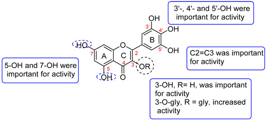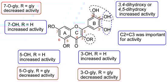 For flavonoids, the structure features required for antioxidant activity depend on the number and positions of hydroxyl (OH) groups, as well as other substituents and the glycosylation of the flavonoid nucleus []. Three structural features are essential determinants of the radical-scavenging activity of flavonoids: (i) the ortho-dihydroxy structure in the B-ring, (ii) the C2=C3 double bond in conjugation through the flavonoid nucleus, and (ii) the 4-oxo function in the C-ring. Flavonoids form complexes with the metal ions using the 3- or 5-hydroxyl and 4-keto substituents or hydroxyl groups in the ortho position in the B-ring, thus resulting in improved antioxidant efficacy. Studies of rare earth metal-chelated flavonol complexes confirmed that, in stable complex structures, the metal cations were found to chelate to 3-hydroxy and 4-keto sites [,,]. Flavone glycosylation of the flavonoids at the 3- or 7-position diminishes their activity compared to the corresponding aglycones [,]. A systematic analysis of the SAR of flavonoid requirements for antioxidant activity is shown in Figure 6.