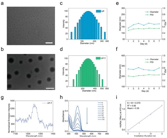 Structural characterization and ROS identification of IrP and IrP-T. TEM images of IrP (a) and IrP-T (b); DLS diagram of IrP (c) and IrP-T (d); Stability of IrP (e) and IrP-T (f) in water; (g) 1O2 emission of IrP-T; (h) Degradation curve of the mixture of IrP-T and DPBF with time under 520 nm light excitation; (i) Calculation of 1O2 yield of IrP-T. (Scale bar: 500 nm).
