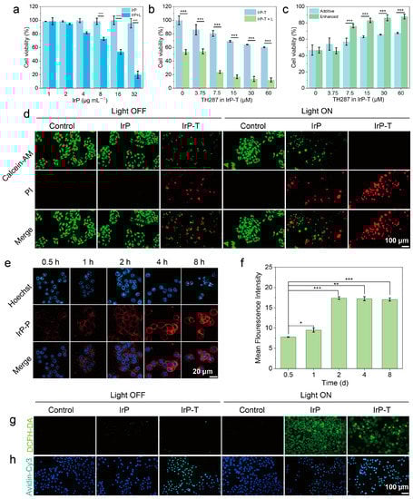 Evaluation of EPDT effect in vitro. (a) Cell viability with or without laser irradiation after co-incubation of 4T1 cells with IrP; (b) Cell viability with or without laser irradiation after co-incubation of 4T1 cells with IrP-T; (c) Enhanced PDT (IrP-T + L) and theoretical addictive therapy (IrP + L and IrP-T); (d) Living cells (green) and dead cells (red) evaluation with Calcein-AM and PI staining after different treatments; (e) The cells were incubated with IrP-P (red) for 0.5 h, 1 h, 2 h, 4 h, and 8 h, respectively, then used hoechst (blue) to localize the nucleus, and photographed with a confocal microscope (λex = 488 nm, λem = 630 nm); (f) A corresponding statistical chart of average fluorescence intensity; (g) ROS detection in cells from the fluorescence of DCF (green) with DCFH-DA staining after different treatments; (h) Detection of intracellular 8-oxo-dGTP after different treatments and used hoechst (blue) to localize the nucleus. (* p < 0.05, ** p < 0.01, and *** p < 0.001).