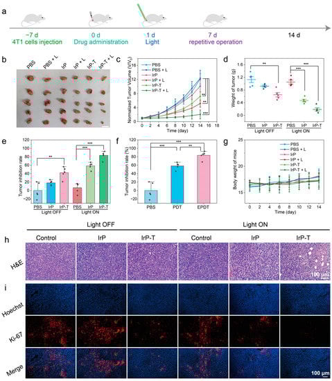 The EPDT effect in mice was further investigated based on the respectable EPDT effect and the passive tumor targeting ability of the IrP-T sensitizer at the cellular level. According to the results of the cell level and in vivo fluorescence imaging, a corresponding therapy strategy was designed (Figure 4a). The tumor-bearing mice were randomly divided into six groups (n = 5): PBS, IrP, and IrP-T, with or without light stimulation. IrP-T was injected into mice via the tail vein, light irradiation was started 24 h later, and mice were treated twice over a 14-day cycle.