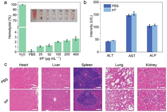 Moreover, the blood routine indexes of mice were studied further. There were no obvious differences in the blood indexes of mice injected with IrP compared with mice injected with PBS (Table S1). In vitro hemolysis experiment results found that the hemolysis rate increased from 1.13% to 2.74% as the IrP concentration increased, which was less than the crucial secure hemolytic ratio for biomaterials (5%), as established by ISO/TR 7406 (Figure 5a). The liver and renal function indexes of mice in both groups did not change greatly after intravenous injection of IrP and PBS (Figure 5b), commenting that IrP did not cause obvious toxicity to mice during the treatment cycle. H&E staining of the main organs (heart, liver, spleen, lung, and kidney) revealed no significant inflammation or tissue destruction (Figure 5c). These findings suggest that IrP has agreeable biocompatibility as a self-assembled nanocarrier and a promising future as a drug delivery system.