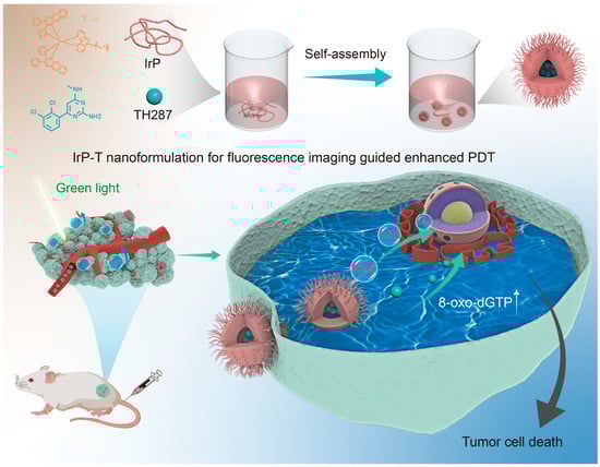 The following supporting information can be downloaded at: https://www.mdpi.com/article/10.3390/molecules28114397/s1, Scheme S1: Synthesis route of IrP; Figure S1: (a) 1H-NMR spectrum and (b) high-resolution mass spectrum of IrP; Figure S2. Absorption curves of IrP-T (IrP = 16 μg mL−1, different concentrations of TH287); Figure S3: Degradation normalization curves of DPBF (a) IrP with different concentrations (100 mW cm−2) and (b) different light power densities (IrP = 32 μg mL−1); Figure S4: Absorption spectra (a) and normalized absorption at 260 nm with time (b) of the mixture of NBT and IrP at 260 nm under 520 nm light irradiation; Figure S5: Statistical particle size distribution of IrP (a) and IrP-T (b); Figure S6: Cell viability fitting curve and IC50 value of IrP + L group; Figure S7: Fluorescence intensity histogram of intracellular ROS after different treatments; Figure S8. Fluorescence intensity histogram of intracellular 8-oxo-dGTP after different treatments; Figure S9: In vivo fluorescence imaging of mice 6 h, 12 h, and 24 h after tail vein injection of IrP-T (λex = 730 nm, λem = 830 nm); Table S1: Blood routine indexes of mice.