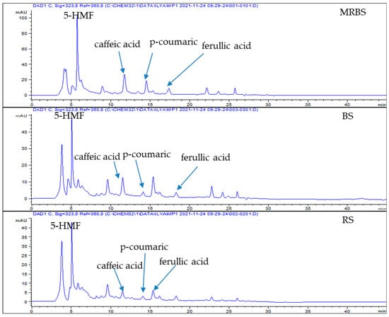 The identification of the compounds was confirmed by comparing the retention times of UV-visible spectra with those standards. The major components identified by HPLC were p-coumaric acid, caffeic acid, syringic acid, and ferulic acid. Table 1 shows the phenolic content in different sugar products (LRS, BS, and RS) ranging from 4.48 to 57.72 µg/mL of the extract. The HPLC chromatogram results of the phenolic compounds of the three sugar cane products were analysed at 323 nm, and the results are presented in Figure 1. Nevertheless, 5-HMF can only be identified from the sugar extract, which was prepared using Method A. This method indicates that caffeic acid, p-coumaric acid, ferulic acid, and 5-HMF were detected in LRS, BS, and RS (Figure 1). However, syringic acid was not found in all three types of sugars. This result was inconsistent with a previously published study by Azlan et al. [11], who found the highest amount of syringic acid in minimally refined brown sugar but found it absent in BS and RS samples.