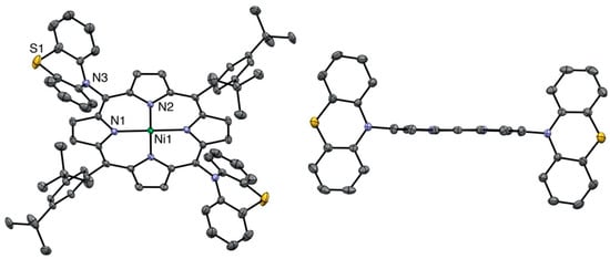 All compounds were characterized by standard spectroscopic techniques. Single crystals were obtained for some of them, and the structures were solved. The X-ray structure of the bis-phenothiazine-substituted nickel(II) porphyrin is presented in Figure 2. As noticed before in the solid-state structures of the 5,15-bis-carbazole- or 5,15-bis-phenoxazine-substituted nickel(II) porphyrins, the porphyrin plane is almost perfectly planar, despite the fact that the metal ion inside the aromatic cavity is nickel(II). Indeed, the vast majority of the nickel(II) porphyrin structures reported in the literature are strongly ruffled because the nickel(II) ion is too small for the inner porphyrin cavity [25].