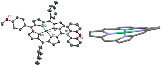 The related nickel(II) porphyrin bearing only one phenoxazine donor was described earlier, but the X-ray structure was missing. In this case (see Figure 4), the macrocycle was slightly ruffled, and the Ni-N distances were shorter than in the two other examples (1.94–1.95 Å instead of 1.95–1.97 Å).