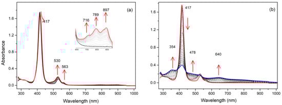 To ascertain the electronic states of the oxidized species of the compounds, spectroelectrochemical studies were carried out. For the monosubstituted porphyrin 1, the first oxidation led to a new compound with almost no changes in the Soret band (from 415 to 417 nm) or the Q bands (see Figure 6). Three new bands appeared at 716, 789, and 897 nm. The very small bathochromic shift of the Soret band clearly indicated that the porphyrin ring was not involved in this redox process, and the new bands were attributed to a radical cation located on the substituent. Under the same conditions, increasing the oxidation potential to a value higher than the second oxidation modified the spectrum drastically. The intensity of the Soret band decreased drastically, showing that now the formation of the porphyrinic π-cation radical was occurring. The same behavior was observed for compound 2 (see Figure S10).