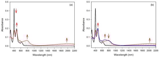The cyclic voltammetry of compound 4 (see Figure 5 right) was similar to the results described earlier for compound 5 and a bis-carbazole-substituted nickel(II) porphyrin, with small differences in potential values [17]. Again, compound 6, bearing two meso-bis-anisylamine donor groups, showed a different electrochemical behavior. The first oxidation step was reversible, but the following oxidation steps proved to be irreversible. The spectroelectrochemical study showed again that the aromatic porphyrinic core was involved in the oxidation processes because the Soret band intensity dropped markedly (see Figure 8). To confirm these observations, an EPR study and DFT calculations were carried out (vide infra).