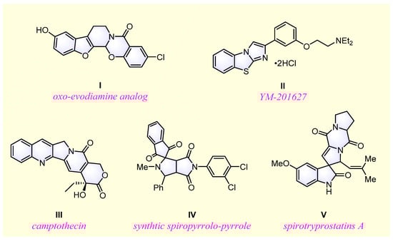 Polyheterocyclic skeletons are frequently found as the common backbone in a variety of natural alkaloids and synthetic organic molecules with remarkable biological activities [1,2,3,4]. As shown in Figure 1, the oxo-evodiamine analogue (I), YM-201627 (II), and camptothecin (III) have been verified to be tumor inhibitors. Spirocyclic furan analog (IV) has been identified as a potent inhibitor of bacterial phenylalanyl-tRNA synthetase. Spirotryprostatin A (V) has been isolated as a novel cell cycle inhibitor in mammals. Therefore, the construction of highly functionalized polyheterocyclic compounds continues to be an important area of research in modern organic synthetic chemistry. A large number of efficient synthetic tactics have been developed for the synthesis of various functionalized polyheterocycles [5,6,7,8,9,10]. Among the various reported methods, [3 + 2] cycloaddition has become one of the most powerful and straightforward synthetic approaches that can be used to construct polycyclic compounds [11,12,13,14,15,16].