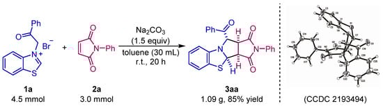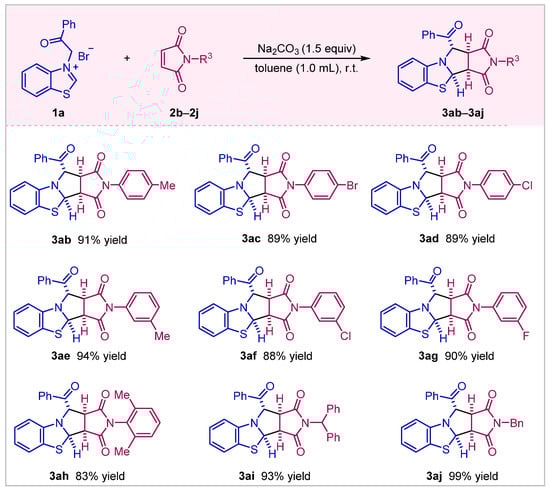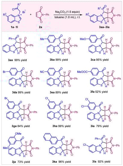 Initially, optimization of the reaction conditions was conducted by choosing benzothiazolium salt 1a and N-phenylmaleimide 2a as the model substrates (Table 1). Several inorganic bases were first tested in DCM at room temperature, and the use of Na2CO3 gave product 3aa in a relatively high yield (entry 3 vs. entries 1, 2, and 4). Interestingly, triethylamine furnished trace product (entry 5). Upon further solvent examination (entries 6–9), the toluene was found to be an appropriate medium to yield the corresponding cycloaddition product with a 99% yield (entry 6). As a result, the best reaction condition consisted of a 1.5 equivalent of Na2CO3 and toluene as the solvent at room temperature.
