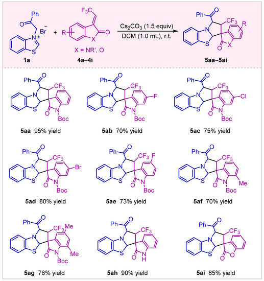 Owing to the unique properties of the trifluoromethyl unit in promoting the metabolic stability and bioavailability of many bioactive compounds [62,63], several CF3-containing heterocyclic compounds, in particular of trifluoromethyl-substituted pyrrolidines, have been synthesized with [3 + 2] cycloaddition reaction in the past few years [64,65,66,67,68]. To expand the application of benzothiazolium salts in constructing spiro-pyrrolidines, the [3 + 2] cycloaddition between benzothiazolium salts and 3-trifluoroethylidene oxindoles was conducted. After a careful screening of bases and solvents (For the detail of the procedure, see Supporting Information), the reaction of benzothiazolium salt 1a with 3-trifluoroethylidene oxindole 4a proceeded smoothly to produce the CF3-containing tetrahydrobenzo[d]pyrrolo[2,1-b]thiazole 5aa with a 95% isolated yield (Scheme 5). On this basis, other 3-trifluoroethylidene oxindoles 4b–4h were evaluated under the optimal reaction conditions, these substrates could be smoothly converted into the corresponding cycloadducts 5ab–5ah in good yields (70–90%). Moreover, 3-trifluoroethylidene benzofuranone was also compatible with the developed system to give product 5ai with a 85% yield.