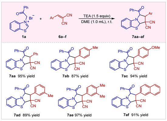 Encouraged by the above success, we questioned whether the application of benzothiazolium salt can be further expanded. Subsequently, many benzylidenemalononitriles 6 were surveyed via reaction with 1a. The reaction optimization study demonstrated that triethylamine (TEA) was the best base for promoting the transformation (For the detail of the procedure, see Supporting Information). The reaction between 1a and 6a could furnish the desired product 7aa in 95% yield (Scheme 6). Further studies indicated that the substituents on the aryl ring (Ar) of benzylidenemalononitriles have a limited effect on the reactivity of the reaction. The benzylidenemalononitriles 6b–6f were compatible with the reaction condition to give the corresponding products 7ab–7af in 87–97% yields.