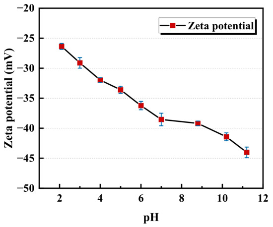 The effect of the pH on the interaction between the montmorillonite and alumina surface can be explained by their zeta potential. Figure 2 shows the zeta potential of the montmorillonite as a function of the pH at the pH range 2–11. A monotonously decreasing trend of zeta potential with an increasing pH value is observed. Even at pH = 2.1, the montmorillonite particles have a large negative zeta potential (−26.5 mV). The isoelectric point of alumina reported in the literature varies widely but is generally located in the range of 6–9 [30]. Below the isoelectric point, the zeta potential of the alumina is positive, and considering the decrease in the pH, the zeta potential of the alumina increases. Therefore, at low pH, the attractive interaction between negatively charged montmorillonite particles and positively charged surfaces is enhanced.