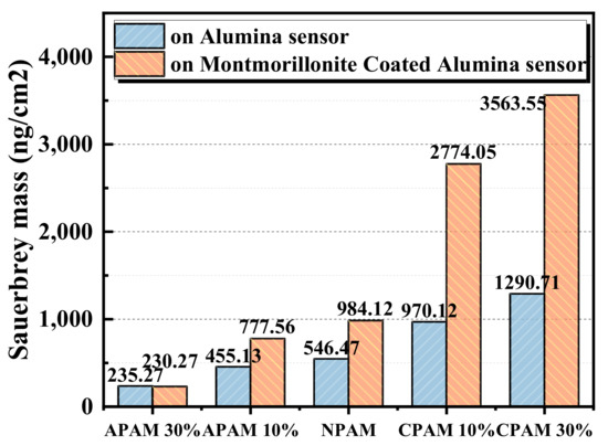 We calculate and compare the adsorption mass of polymers on the alumina sensor and montmorillonite pre-adsorbed alumina sensor as shown in Figure 5. Figure 5 demonstrates that the adsorption mass of the CPAM 30% is the highest, and that of APAM is the lowest on both sensors. The adsorption mass of APAM 30% on the montmorillonite pre-adsorbed alumina sensor is a little lower than on the alumina sensor. The adsorption mass of NPAM on the alumina surface and montmorillonite pre-adsorbed alumina sensor is 0.54 mg/cm2 and 0.98 mg/cm2, respectively. The adsorption masses of the CPAM 30% on the alumina surface and alumina surface with montmorillonite adsorption layer are 1.29 mg/cm2 and 3.56 mg/cm2, respectively. The existence of montmorillonite can greatly enhance the adsorption of the CPAM and NPAM on the sensor.