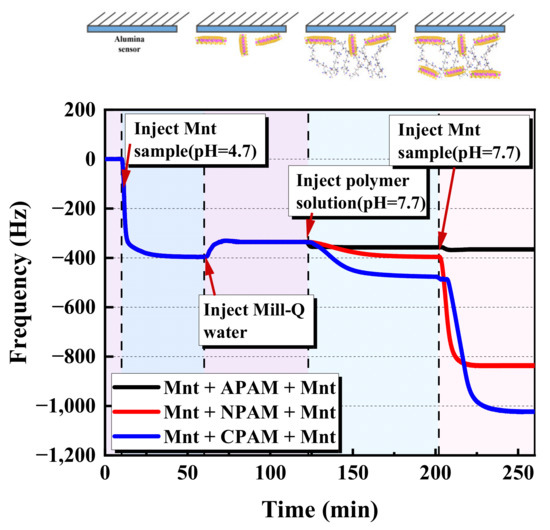 To further reveal the bridging interactions of polymer flocculants on montmorillonite particles, we selected APAM 30%, NPAM and CPAM 10% as representatives of different ionic types of PAM to conduct subsequent research with QCM-D as shown in Figure 6. After the polymer adsorption layer was formed (added for 70 min), the montmorillonite particles were injected into the QCM-D cell again. Considering the results of the CPAM cases, the shift of frequency is the largest (−580 Hz). This indicates the strong bridging effect the CPAM has on the montmorillonite particles. Moreover, NPAM exhibits a large shift in frequency and a strong interaction with the montmorillonite particles (−420 Hz). Regarding the APAM, its bridging interaction between the montmorillonite particles can be ignored based on the minor frequency change.