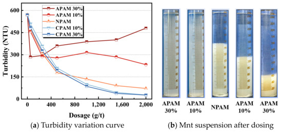Figure 7 shows the clarification performance of the montmorillonite suspension as a function of the dosage and type of polymer. Figure 7b shows the turbidity of montmorillonite suspension with different reagents when the dosage is 1.5 kg/t. The turbidity of the supernatant is 580 after setting 20 min without adding any polymer. When the dosage is less than 300 g/t, the clarification effect of the APAM is better than that of NPAM and CPAM, and CPAM is the worst. This may be caused by the difference in the actual molecular weight. The higher the molecular weight, the smaller the number of polymers needed to produce the same clarification effect. With the dosage of APAM increasing, the turbidity increases, and the clarification effect decreases. The NPAM and CPAM usually require high dosages to achieve the clarification of montmorillonite. Regarding the increase in the dosage, the turbidity of NPAM and CPAM decreases, and the clarification effect increases. We found that when we added enough polymer, CPAM produced the best clarity, followed by NPAM, and APAM had the worst clarity. Generally, CPAM and NPAM reveal better flocculation and clarification effects than NPAM.