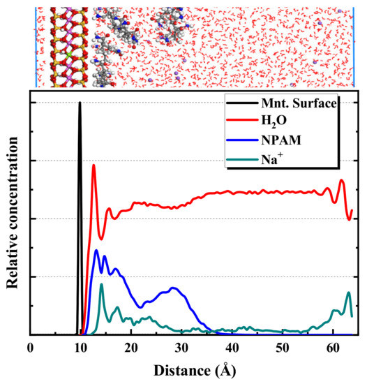 Distribution of the average relative concentration of components in montmorillonite/NPAM/water simulation system.