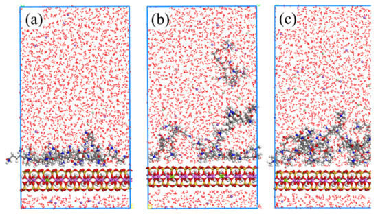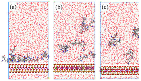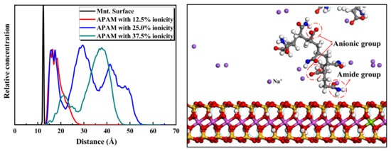 Considering Figure 10, regarding the case of ionicity 12.5%, the APAM molecules can still be adsorbed on the montmorillonite surface. However, when the ionicity of APAM increases to 25.0% and 37.5%, it tends to be freely dispersed in water rather than be adsorbed on the montmorillonite surface. Figure 11 shows the statistical distribution of different ionicity APAMs in the simulation system. The results clearly show that the increasing ionic degree of the APAM results in the weakening of its interaction with the montmorillonite. When the ionicity is 12.5%, APAM concentrates at position 3 Å from the surface. Considering ionicity 25.0%, APAM presents a multilayer distribution, indicating that some APAMs adsorb on the surface of montmorillonite, whereas some are dispersed in the water. When the ionicity is approximately 37.5%, APAM is mainly distributed 38 Å away from the montmorillonite surface. This indicates a very weak interaction and most APAMs cannot be adsorbed to the montmorillonite surface.