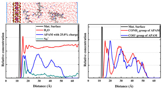 The 25.0% ionicity APAM simulation system is considered an example to reveal more details of the distribution of components and functional groups. The results are shown in Figure 12. Considering the figure, a hydration shell is formed at 3 Å from the montmorillonite surface, and the Na+ layer from the montmorillonite surface is a little farther than the water. The position of the APAM layer is quite close to that of the hydration shell. Although APAM presents a multilayer distribution, the amide groups CONH2 of the APAM molecules are closer to the montmorillonite surface than the anionic functional groups COO-. This indicates that the hydrogen bond between the amide group CONH2 and the montmorillonite surface promotes the adsorption of APAM on the montmorillonite surface. Nonetheless, the repulsion between the anionic group COO- and the montmorillonite surface hinders the adsorption of APAM on the montmorillonite surface. When the content of the anionic group in APAM is low, the attraction between the amide group and the montmorillonite surface is dominant, and APAM can still adsorb on the montmorillonite surface. However, when the content of the anionic functional groups in APAM is high, the repulsion between the anionic groups and the montmorillonite surface is dominant. This makes it difficult for APAM to be adsorbed on the montmorillonite surface.