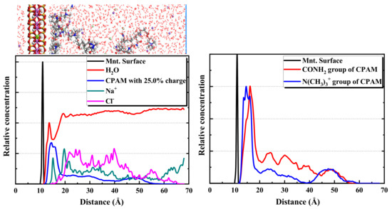 Figure 13 and Figure 14 present the simulation results of the CPAM system. Contrary to APAM, CPAM shows a good adsorption performance on the montmorillonite surface. However, the configuration of the adsorption layer changes with the variation of the polymer ionicity. Moreover, CPAM is concentrated at 3 Å from the surface of the montmorillonite. Regarding the 12.5% ionicity, a tight adsorption layer of the CPAM is formed. When the ionicity increases to 35%, the wide distribution peak of the CPAM indicates that the adsorption layer is relatively thick and loose. This is because of the increase in the number of ionicity functional groups. This leads to an increase in the intermolecular and intramolecular repulsion forces.