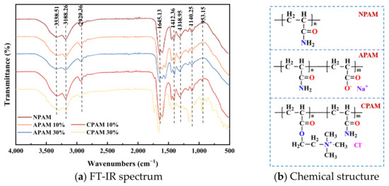 The FTIR spectra and chemical structure comparison of the anionic, cationic and nonionic PAM used in the experiment are shown in Figure 16. From the graphs, it can be observed that all PAM formulations exhibit an absorption peak at 3338 cm−1, corresponding to the N-H stretching vibration of the amide groups in the acrylamide structure. Due to the hydrophilic nature of the polymers, a stretching vibration peak of -OH appears at 3188 cm−1, possibly attributed to water molecules. The characteristic CH2 absorption peak connected to N is observed at 2923 cm−1. At 2132 cm−1, a non-symmetric stretching vibration peak of the methylene-CH2 group in the aliphatic tertiary amide structure is present. The stretching vibration peak of the C=O group in the amide structure unit can be seen at 1645 cm−1. Vibrational absorption peaks of the methylene-CH2 group are observed at 1474 cm−1 and 1274 cm−1. For the CPAM, an absorption peak of the quaternary ammonium group is observed at 953 cm−1. At 1140 cm−1, there is a methyl-CH3 peak connected to N+. As the degree of ionization increases, the corresponding structural peak becomes more pronounced. Regarding the APAM, two absorption peaks resembling carboxylic acid are observed around 1550 cm−1 and 1400 cm−1, representing the carboxylate-COONa structure.
