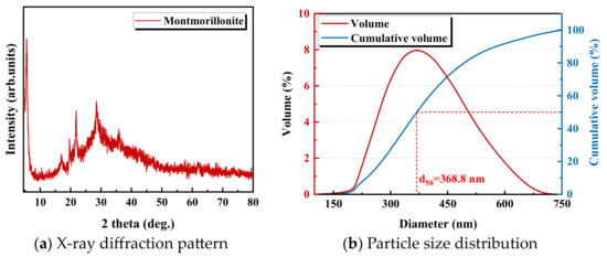 X-ray diffraction pattern and laser particle size distribution of the prepared montmorillonite particles.