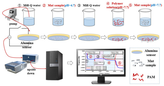 First, a starting baseline was established by the Mill-Q. Then, the montmorillonite suspension of pH = 4.7 was pumped into the chamber of the QCM-D. This operation lasted for 50 min to make sure the montmorillonite particles were fully absorbed on the sensor. Next, the Mill-Q water was pumped into the cell for 1 h to remove the weakly absorbed particles on the surface and to adjust the pH close to neutral. Finally, the polymer solution (concentration 50 ppm and pH 7.7) was introduced. After the injection of the polymer for approximately 70 min, we injected the montmorillonite suspension (pH = 7.7) into the cell. Figure 18 shows a Diagram of the QCM-D test process.