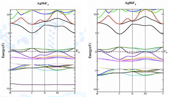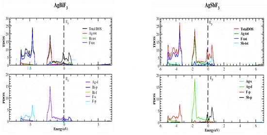 In this part, we study the electrical characteristics of AgZF3 complexes (Z = Sb, Bi) by establishing the actual band structure diagrams, DOS, and charge distribution diagrams. The band separation of semiconductors and insulating materials can be originated using well-known LDA and GGA computations [17,18]. The main reason for this is the inability of their fundamental geometries to reliably recreate the exchange-correlation technique and its change in charge. The underestimation of the band parting was resolved using the TB-MBJ approach, which has been effectively utilized in many recent publications [15,19,20]. The detected energy band structures for the AgZF3 geometry (Z = Sb, Bi) at equilibrium along directions of great symmetry are provided in Figure 3. The null energy level at the peak of the valence band is chosen to be the Fermi energy, EF. Both compounds are metals because their valence band (VB) peaks and conduction bands greatly overlap. Conduction group minima are positioned at balance point X, whereas lower band peaks are located at balance point M, resulting in an indirect (X-M) for AlAgF3. AlSF3, on the other hand, exhibits a metallic nature since its conduction band minima are at “X” and cross the Fermi energy level. In order to better understand the electronic assembly, the TDOS and PDOS (total and partial concentration of states) of AgZF3 complexes (Z = Sb, Bi) are shown in Figure 4. The vertical dashed lines at EF = 0.0 eV represent the Fermi energy region, whereas the DOS ranges from −6.0 to 6.0 eV. While the valance band is to the left of EF, the conduction band of the DOS is to the right. The F-tot, F-p, and Ag-d states are all in the valence band for AgBiF3, with energies varying from −4.20 to −6.40 eV and 0.0 to −2.50 eV, contributing prominently.