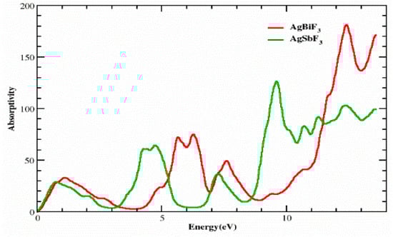 When the dielectric function is used, as shown in Figure 6, the absorption factor I(ω) can be identified. According to Figure 6, the chosen compounds have significant absorption factors at energies between 8.5 eV and 14.0 eV for both AgSbF3 and AgBiF3. AgSbF3 and AgBiF3 each have the same threshold values, which are 0 and 0 at 0 eV, respectively. AgSbF3 exhibits distinct absorption peaks at energies of 0.8, 4.2, 4.9, 9.5, and 12.5 eV with values of 30, 65, 70, 140, and 100, respectively. In contrast, AgBiF3 exhibits absorption peaks of 35, 80, 82, 50, and 195 at energies of 1.2, 5.5, 6.5, 7.6, and 12.5 eV, respectively. At low energies, the compound AgSbF3 exhibits a low level of absorption and is comparatively transparent. These substances have strong levels of absorption at high energy levels.
