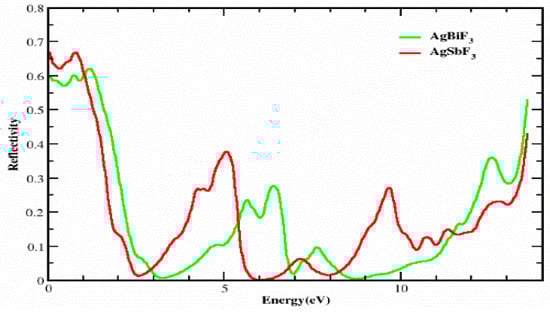 Figure 7 displays the R(ω) vs. energy, which was calculated based on the dielectric permittivity, over the energy array of 0.0 eV to 14.0 eV. The reflectance R(0) values at zero frequency for AgSbF3 and AgBiF3 are 0.6 and 0.66, respectively. For both compounds, it remains approximately in the same range, up to 1.5 eV. The reflectance of AgSbF3 first drops to 0.01 at 2.5 eV, then climbs to a peak value of 0.4 at 5.0 eV, then drops to 0.0 at 6.0 eV, and so on: as the photon energy increases, its reflectivity surges. The AgBiF3 compound has distinct peaks at 5.5, 6.5, and 12.6 eV, with values of 0.25, 0.31, and 0.35, respectively. As the photon energy increases, the reflectivity of AgBiF3 increases as well. AgSbF3 is more transparent than AgBiF3 in the energy ranges of 0 to 1.5 eV, 3 to 5.5 eV, and 8.2 to 12.5 eV because AgSbF3 has a much lower reflectance than AgBiF3 in these ranges. The transparency of the materials suggests that these complexes can be employed to create lenses.