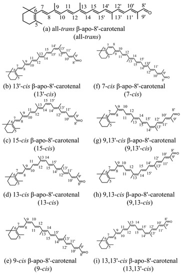 The chemical structures of all-trans and cis isomers of β-apo-8′-carotenal.