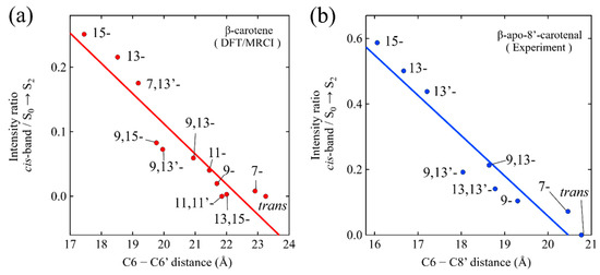 (a) Relationship between the C6-C6′ distance of geometrically optimized structures of isomeric β-carotene and the ratio of the theoretically predicted oscillator strength of the cis-band transition divided by that of the S0 → S2 transition of the isomers. This figure was drawn using the data presented in ref. [33]. (b) Relationship between the C6-C8′ distance of the geometrically optimized structures of the isomers β-apo-8′-carotenal and the ratio of experimentally determined intensity of the cis-band transition divided by that of the S0 → S2 transition of the isomers in n-hexane solutions at room temperature.