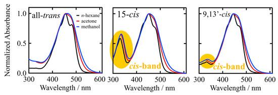 We further investigated the solvent dependence of the absorption spectra of the isomers of β-apo-8′-carotenal. As an example, Figure 4 shows the absorption spectra of the all-trans, 15-cis and 9,13′-cis isomers of β-apo-8′-carotenal in n-hexane (non-polar solvent), acetone (polar aprotic solvent), and methanol (polar protic solvent) at room temperature (see Figure S1 in Supplementary Materials for the absorption spectra of all the isomers). In all the cases of the isomers, the main S0 → S2 absorption bands become asymmetrically broad in polar solvents and the vibrational structures become blurred. The extent of the broadening is stronger in methanol than in acetone, which may reflect the possibility of the hydrogen bonding of methanol to the C=O group of β-apo-8′-carotenal, in addition to the higher polarity of methanol than acetone. The cis-bands of the isomers show a red-shift in polar solvents, which is larger in methanol than in acetone. However, the linear relationship between the intensity ratio of cis-band/S0 → S2 transitions, which is similar to that in n-hexane, can also be seen in the cases of acetone and methanol solutions (see Section S2 in Supplementary Materials). This suggests that the C6-C8′ distance can also be a strong measure to use in comparison with the intensity ratio of the cis-band/S0 → S2 transitions, even in the case of the isomers of β-apo-8′-carotenal in polar solvents.