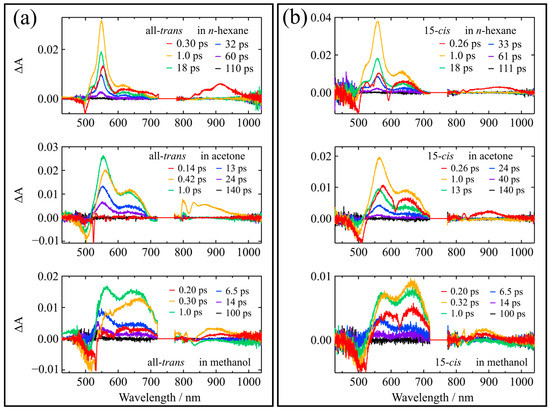 Femtosecond time-resolved absorption spectra of the (a) all-trans and (b) 15-cis isomers of β-apo-8′-carotenal in n-hexane, acetone, and methanol recorded at selective delay times at room temperature.