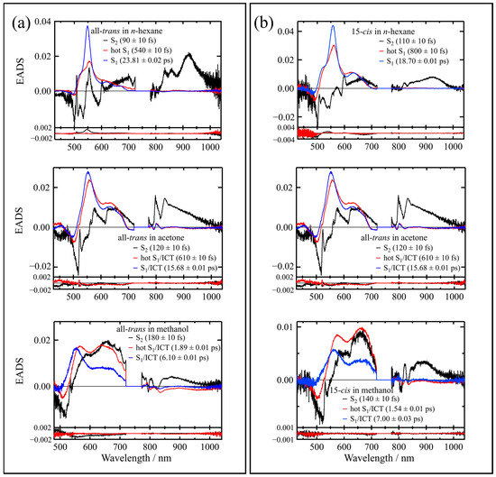 The middle panel in Figure 6a shows the EADS of the transient species produced by the excitation of the all-trans isomer in acetone. The time-resolved absorption dataset of the all-trans isomer in acetone can be well accounted for with three components: the first 120 ± 10 fs, the second 610 ± 10 fs, and the third 15.68 ± 0.01 ps components. In contrast to the results, in n-hexane solution, the sharp peak that is ascribable to the S1 → Sn transition around 550 nm becomes broader and enhancement of the broad absorption in the 600–700 nm spectral region is seen. This broad absorption feature in the 600–700 nm region is characteristic of the ICT state. Therefore, we tentatively assign the transient absorption band that gives rise to the third EADS (15.68 ± 0.01 ps component) to the S1/ICT states, since the attribution of specific features to S1 or ICT-photoinduced absorption is still under debate [2,3]. It is noted here that the first and the second EADS show the longer lifetimes than those in n-hexane, and the third EADS shows a shorter lifetime than that in n-hexane. Similar results are observed for the 15-cis isomer as illustrated in the middle panel in Figure 6b, although once again, the first 130 ± 10 fs and second 1.25 ± 0.01 ps EADS show longer lifetimes compared to those of the all-trans isomer in acetone, and the third 12.87 ± 0.01 ps EADS show a shorter lifetime than that of the all-trans isomer in acetone.