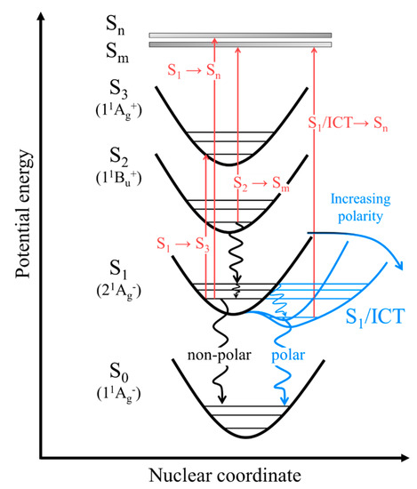 In order to obtain a clearer understanding of the underlying optical processes, Figure 7 represents the potential energy surfaces summarizing the excited-state absorption, internal conversion, and vibrational relaxation after the S0 → S2 excitation of β-apo-8′-carotenal. The red arrows indicate excited-state absorptions: S1 → Sn, S2 → Sm, S1 → S3, and S1/ICT → Sn. The black, wavy lines represent internal conversion and vibrational relaxation in a non-polar solvent. In a polar-solvent environment, the potential energy surface of the S1/ICT state, shown in blue, is stabilized. Therefore, the vibrational relaxation and internal conversion in a polar solvent follow the path indicated by the blue, wavy lines. The potential energy surfaces of the Sn and Sm states are represented by thick, gray lines due to the lack of knowledge.