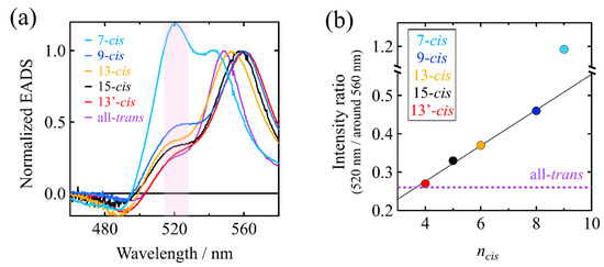 (a) Comparison of the normalized EADS of the S1 species of the all-trans and all the mono-cis isomers of β-apo-8′-carotenal in n-hexane. The pink shade highlights the difference in the intensity of the 520 nm absorption bands of the isomers. (b) The relationship between the intensity ratios 520 nm absorption band/around 560 nm absorption band of the cis isomers of β-apo-8′-carotenal and the number of C=C bonds (ncis) from the C=O group to the cis-bend in the cis isomers. The intensity ratio of the all-trans isomer is shown with a broken, purple line for the reference, as ncis cannot be defined for the all-trans isomer.