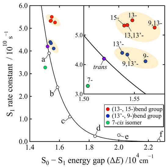 The relationship between the rates of relaxation from the S1 state and S0–S1 energy gaps () of the isomers of β-apo-8′-carotenal determined in this study and that of the all-trans carotenoids reported in the earlier study [34]; a: 3,4-dihydrospheroidene, b: fucoxanthin, c: 3,4,5,6-tetrahydrospheroidene, d: 3,4,7,8-tetrahydrospheroidene, e: mini-7-β-carotene, f: mini-5-β-carotene. The solid black line, which was drawn by the fitting with equations of the energy-gap law (Equations (1) and (2)) to the dataset shown with open black circles, was reproduced from ref. [34]. The inset shows the expansion of the part of the isomers of β-apo-8′-carotenal.