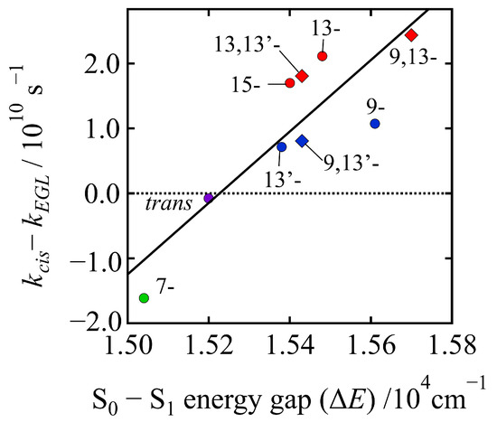 In order to apply the energy-gap law to the present dataset, the S1 state energies () of the cis isomers of β-apo-8′-carotenal in n-hexane must be determined. To do this, we have estimated the S1 state energies of the cis isomers by referring to the energies of the cis-peak in the steady-state absorption spectra and to the small absorption peaks that are seen in the 650–700 nm spectral region of the EADS of the S1 species of the cis isomers in n-hexane (see Section S5 in Supplementary Materials). Since the cis-peak in the steady-state absorption is attributed to the S0 → S3 (11Ag+) transition and the small absorption peak that appears in the longer wavelength side of the main absorption band in the EADS of the S1 species is attributed to the S1 → S3 transition of the cis isomer [29,30], the S1 state energies can be calculated by subtracting the energies of the S1 → S3 transitions from those of the S0 → S3 transitions of the cis isomer in n-hexane. For the S1 energy of the all-trans isomer, the reported value (15,200 cm−1) was adopted [21].