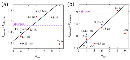 The relationship between the (a) kacetone/kn-hexane or (b) kmethanol/kn-hexane and the number of C=C bonds (ncis) from the C=O group to the cis-bend in the cis-isomers of β-apo-8′-carotenal. Here, kn-hexane, kacetone, and kmethanol show, respectively, the rates of the relaxation of the S1 or S1/ICT states of the isomers in n-hexane, acetone, and methanol. The kacetone/kn-hexane or kmethanol/kn-hexane values of the all-trans isomer were illustrated with a broken purple line for the reference. The solid black lines were drawn by the least square fittings of the data without the 7-cis isomer.